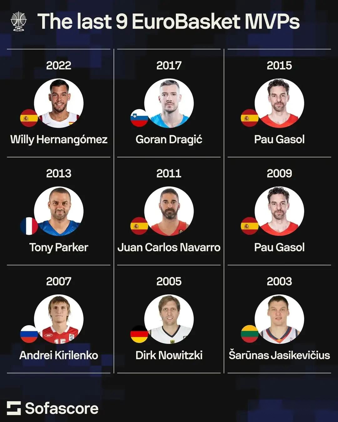 芬蘭93-90險勝瑞典,馬爾卡寧出戰32分鐘,投籃15中7,三分4中2,罰球14中12,狂砍28分6籃板3助攻2搶斷。 今夏三場熱身賽,他場均40.3分!下面這張圖是過去9屆歐洲杯MVP,其中大加索爾兩次,帕克、諾維斯基等各一次。