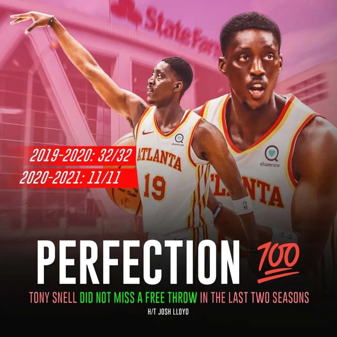 斯內爾并非一無是處,生涯最后三個賽季,罰球命中率都是100%。2020-21賽季,他在老鷹場均5.3分2.4籃板1.3助攻,三項命中率:51.5%,56.9%,100%。 斯內爾成為NBA首位單賽季命中率50+50+100的球員(運動戰至少出手100次)。