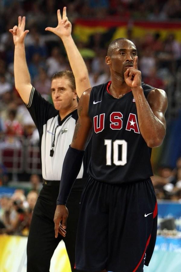 這幅涂鴉作品呈現的是2008年北京奧運會籃球項目決賽中,美國男籃擊敗西班牙男籃比賽的最后時刻的一幕,當時美國男籃的領先優勢被縮小到5分,科比在左翼45度持球干拔三分,球進的同時還造成了本場比賽發揮出色的西班牙球員魯迪-費爾南德斯的第5次犯規,后者犯滿離場,科比則做出了噤聲的手勢慶祝這記進球。