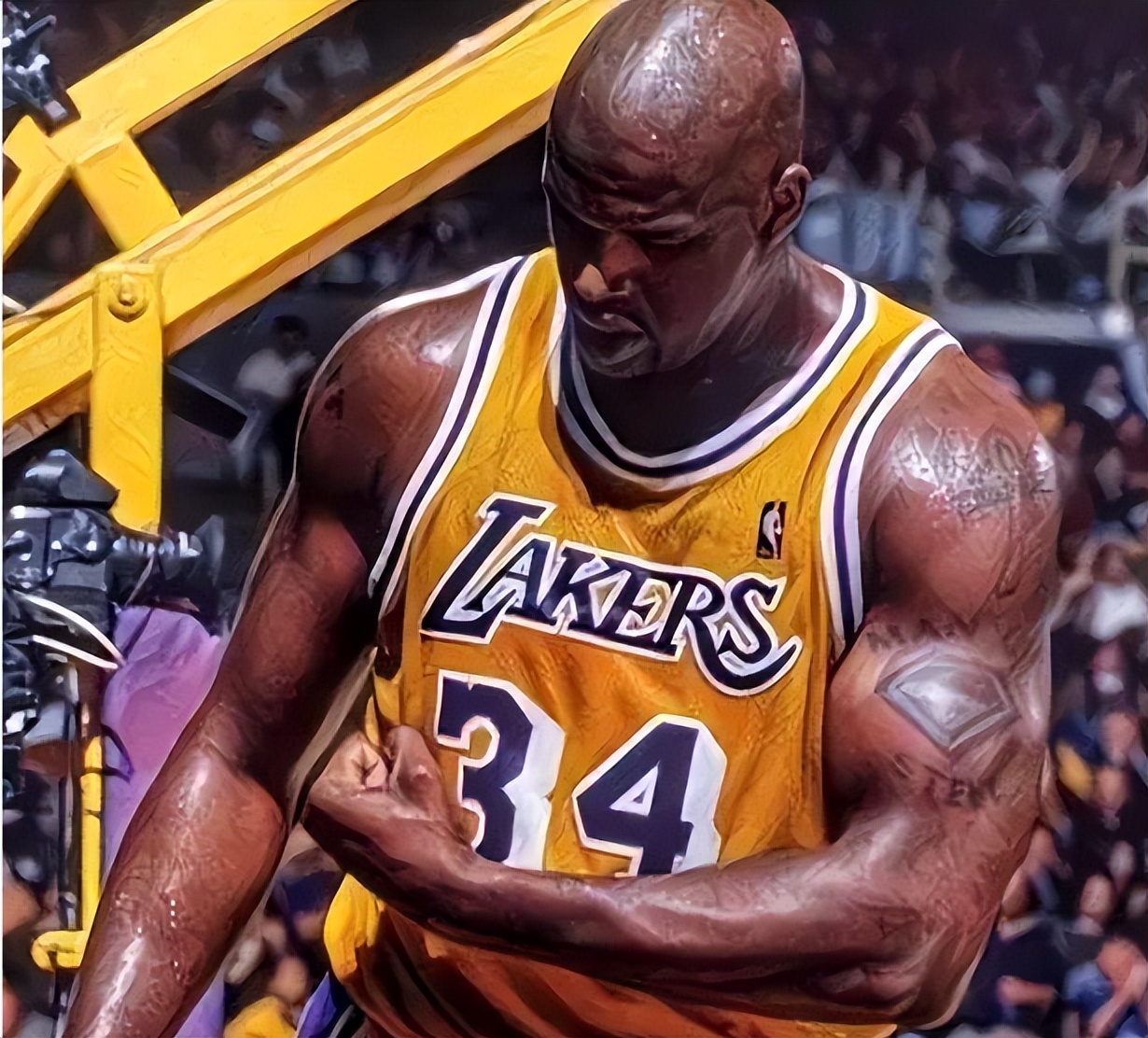 最后是奧尼爾,他打球就是身體碾壓,籃框都被他扣碎了幾個。奧尼爾2米16體重巔峰接近400斤,跟他對位真的會有一種骨頭都要散架感覺。他手臂圍度在NBA歷史第一,目測至少是50cm,這是職業健美水準。真要是巔峰奧尼爾空降這個時代,聯盟都會被他摧毀,小球打法也會不復存在。