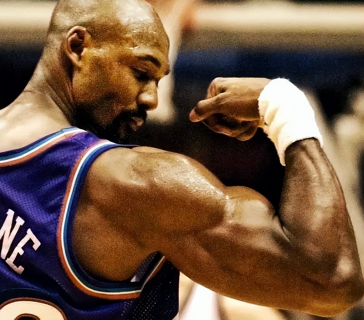 卡爾馬龍打球夠臟夠狠,在90年代對抗如此激烈時期,他能打19年幾乎年年全勤,這身體素質絕對是非人類存在。馬龍能幾乎不傷,一方是懂得保護自己,還有就是厚實肌肉確實有效讓自己避免了傷病。他肌肉就像盔甲一樣保護自己身體,當他把自己獨一檔手臂肌肉秀出來,對手心理防線已經崩塌了一半。