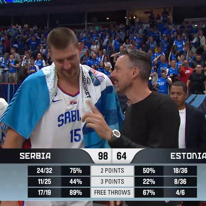 本場比賽,塞爾維亞男籃實力遠勝于對手愛沙尼亞男籃,他們也很快取得大比分領先優勢,最終以34分大勝對手。效力于掘金隊的塞爾維亞當家球星約基奇在本場比賽中“微微出汗”,他出場23分鐘,4投3中拿到11分10籃板7助攻的兩雙數據,三分球1中0,罰球6中5,出現了3次失誤,正負值為全場最高的+39。