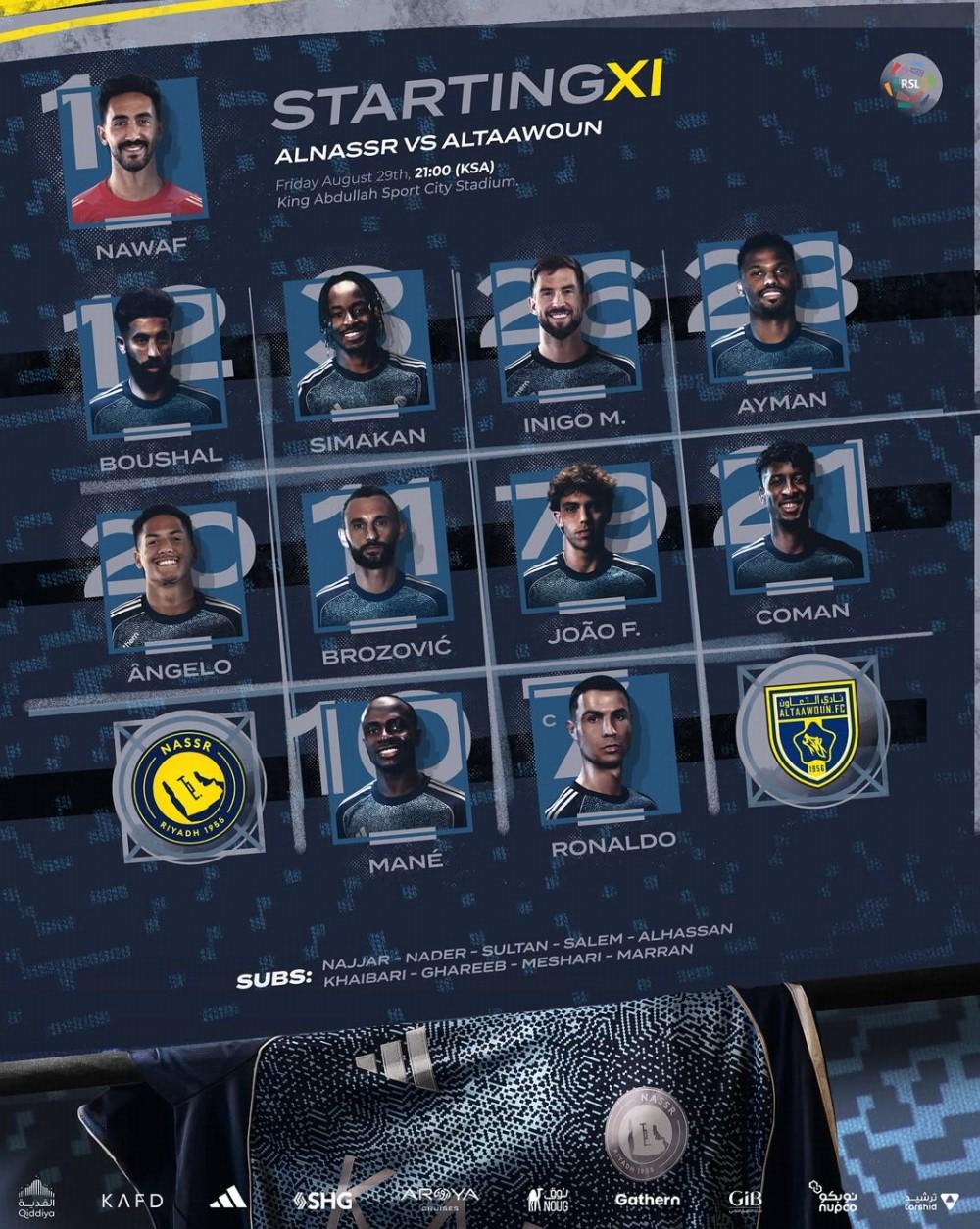 利雅得勝利首發: 1-阿奇迪、12-布歇爾、3-西馬坎、26-伊尼戈-馬丁內斯、23-葉海亞、20-安熱洛-博爾熱斯、11-布羅佐維奇、79-菲利克斯、21-科曼、10-馬內、7-C羅